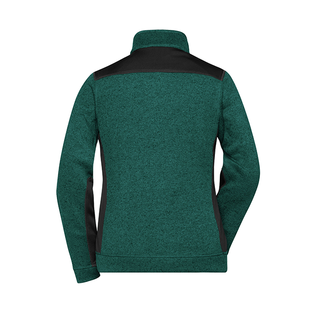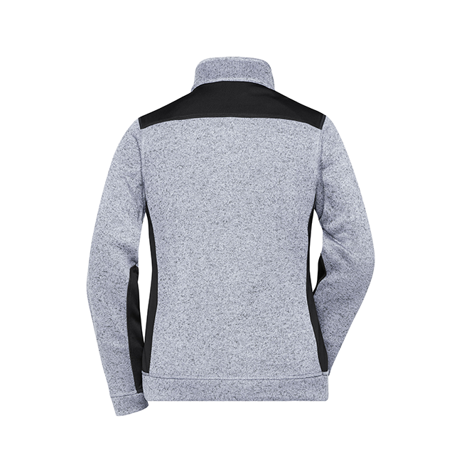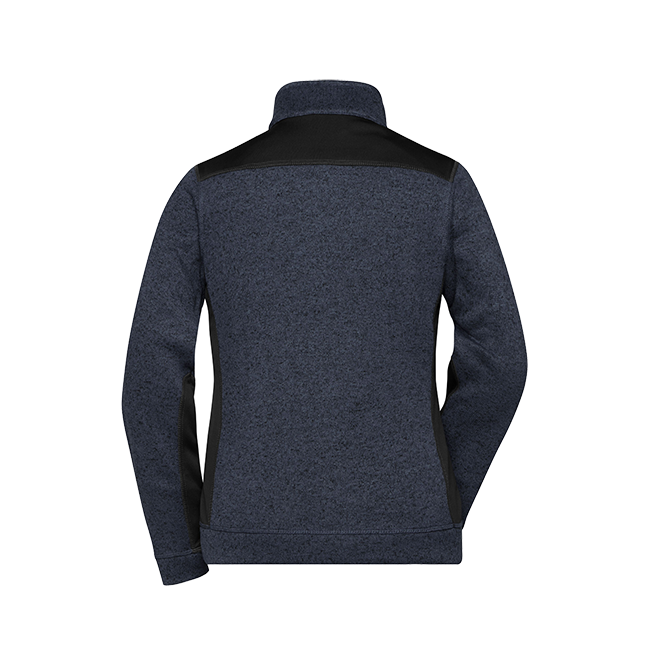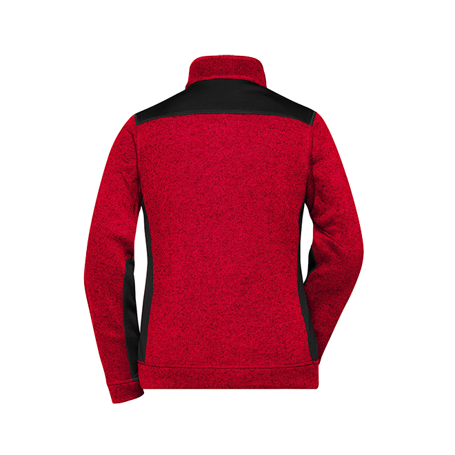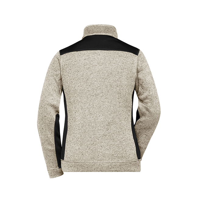 Weiches, wärmendes, pflegeleichtes Material in Melangeoptik Außenseite Strickoptik, Innenseite flauschig weich angeraut Elastische Softshelleinsätze an Seite, Schulter und Ärmel 2 Seitentaschen mit verdecktem Reißverschluss Stehkragen Durchgehend unterlegter Reißverschluss mit Kinnschutz JN861: leicht tailliert